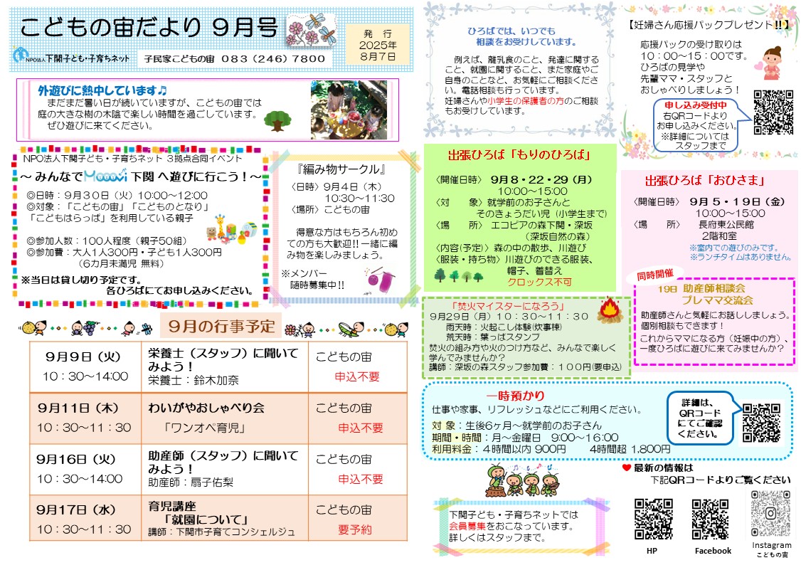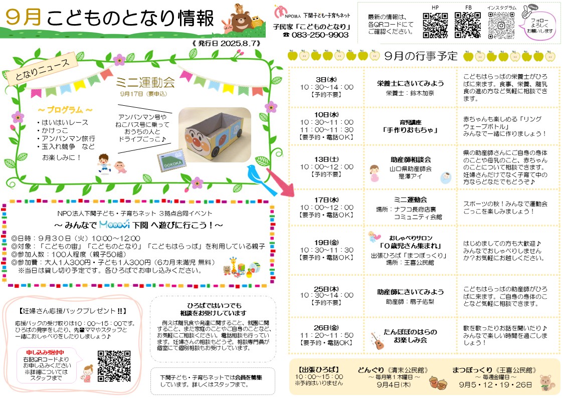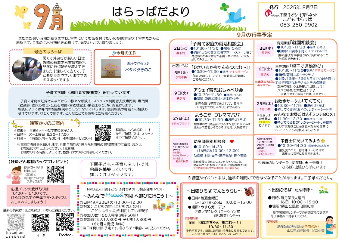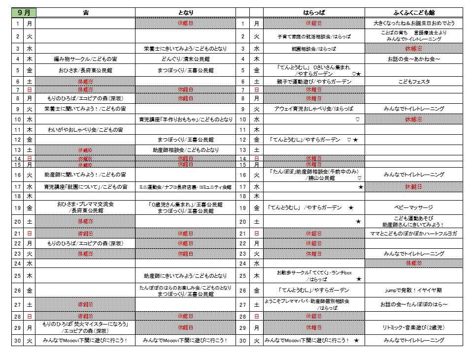 9月の3拠点のおたよりと予定表を発行しました