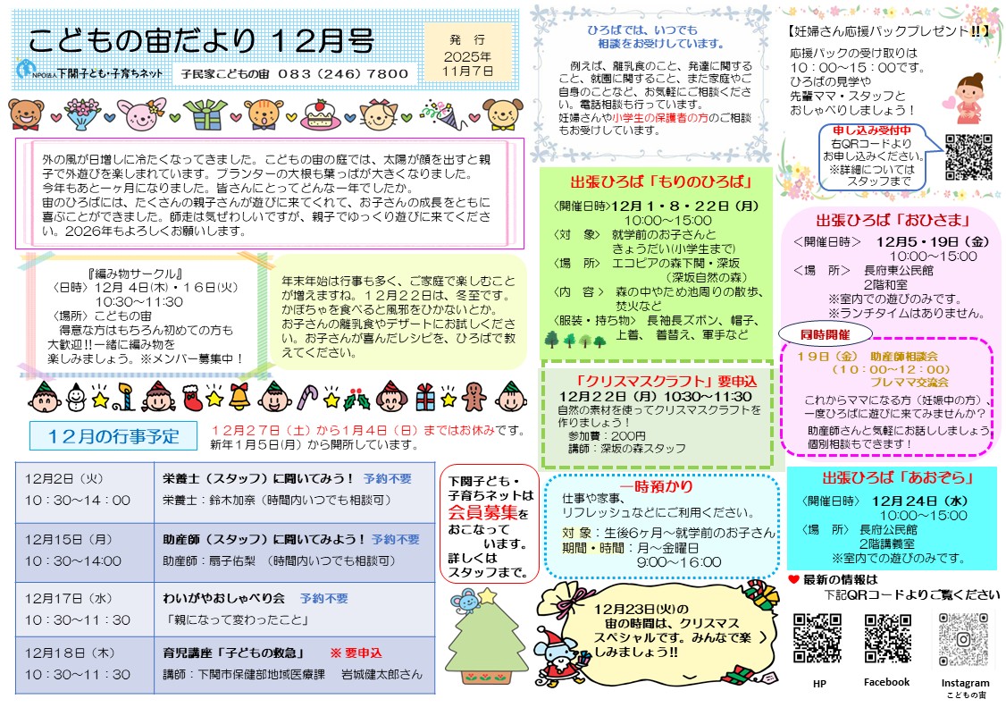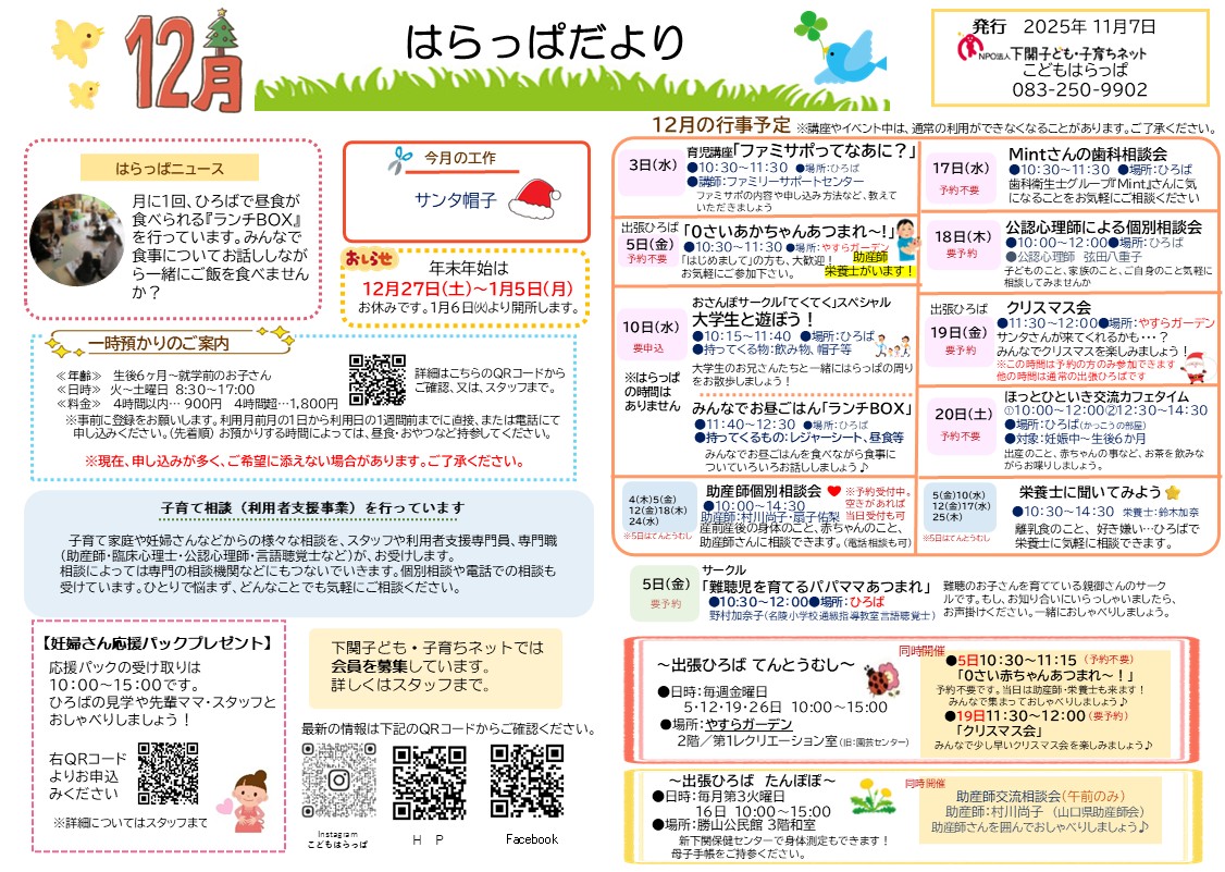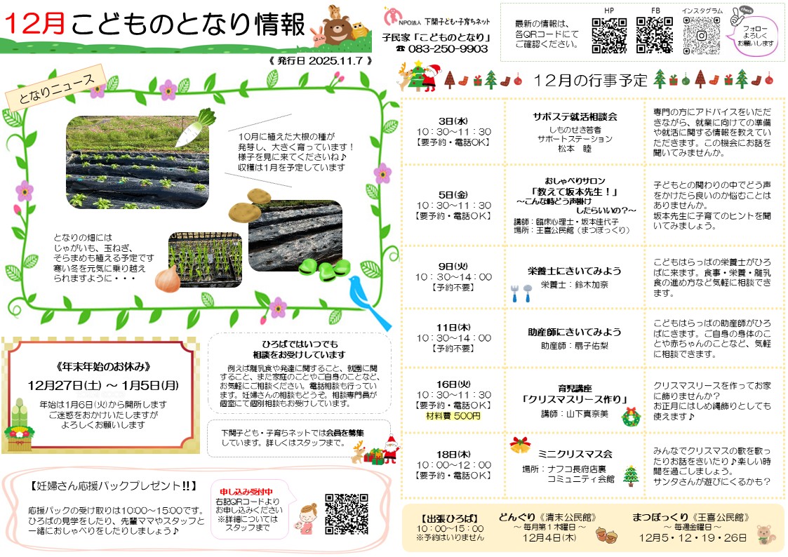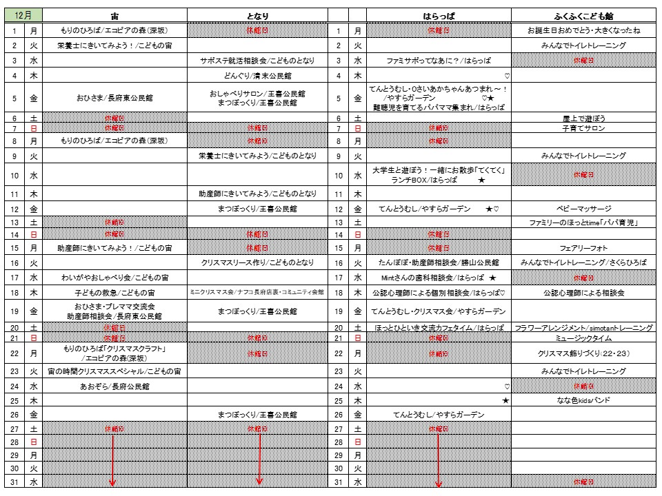 12月の3拠点のおたよりと予定表を発行しました