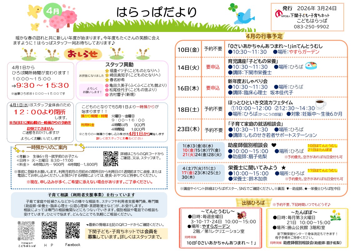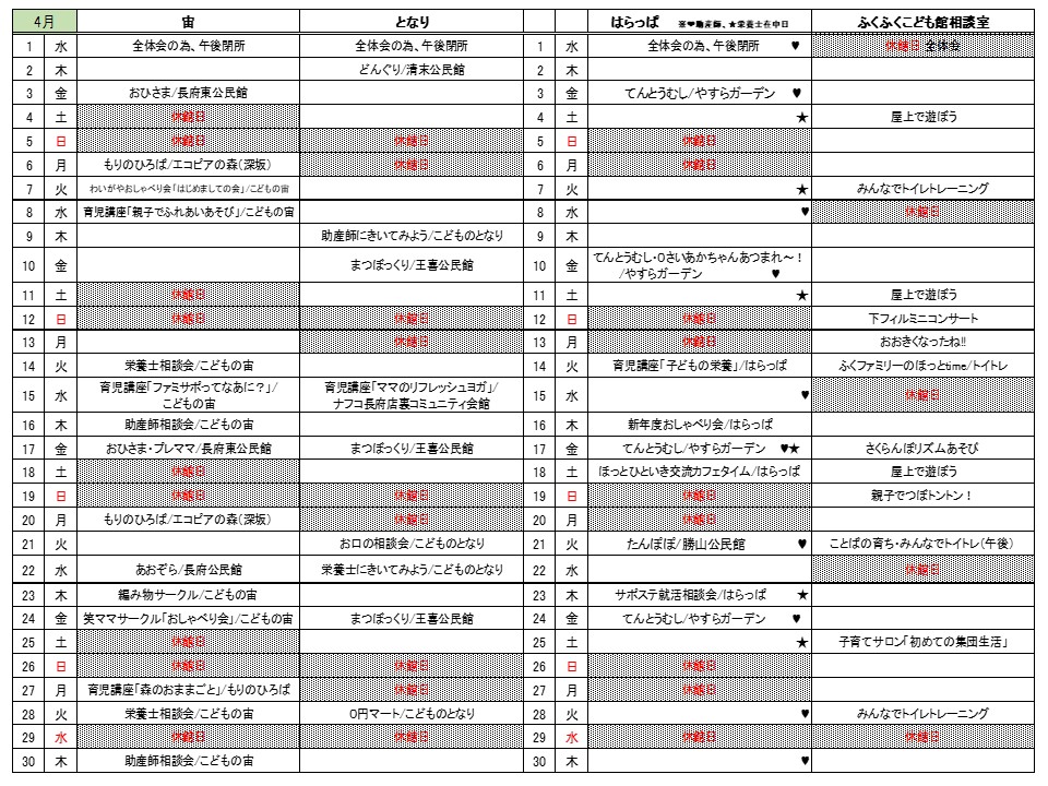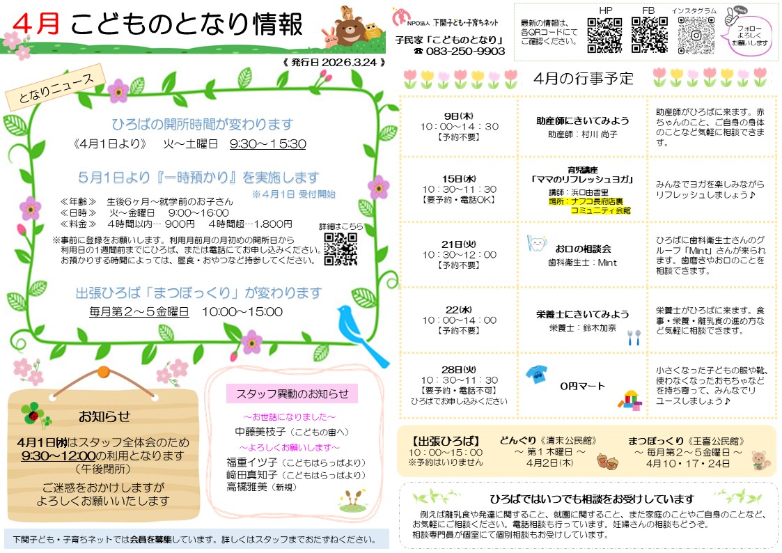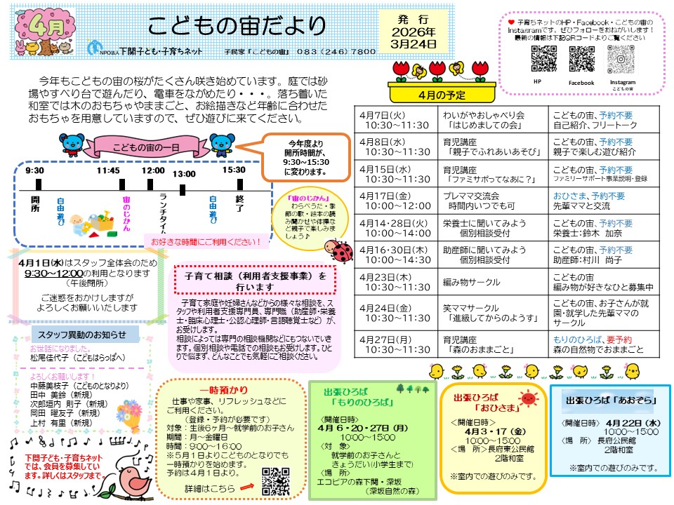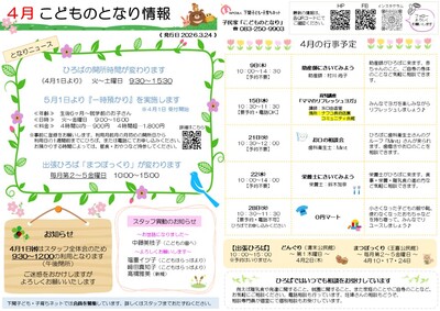 4月の3拠点のおたよりと予定表を発行しました。